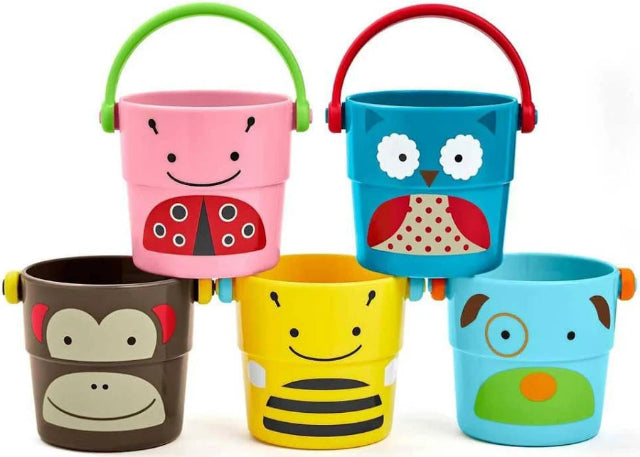 Make bath time extra fun with this colourful set of Stack & Pour Buckets! Specially sized for little hands, each of the five buckets features a friendly Skip Hop Zoo character and a handy handle for easy scooping. Your child can fill, pour, and watch water sprinkle out in different ways—each bucket has its own unique sprinkle effect for endless giggles and play.🛁