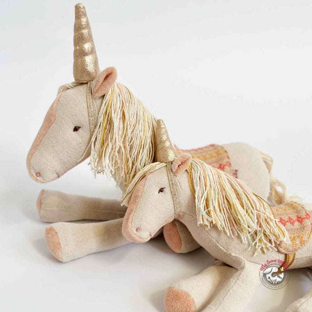 This petite unicorn may be small, but she's packed with magic! With her beautiful colourful tones and shimmering golden horn, she's the perfect size for little hands to hold and love🤍