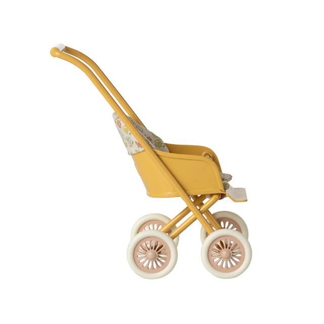 Perfectly sized for small furry friends and their babies, this compact yellow stroller is ideal for day trips to the park, visits around town, or simply wheeling little ones around the Maileg house. With its charming design featuring metal frame, cotton fabric, and rubber wheels, it's built for years of imaginative play.🐭