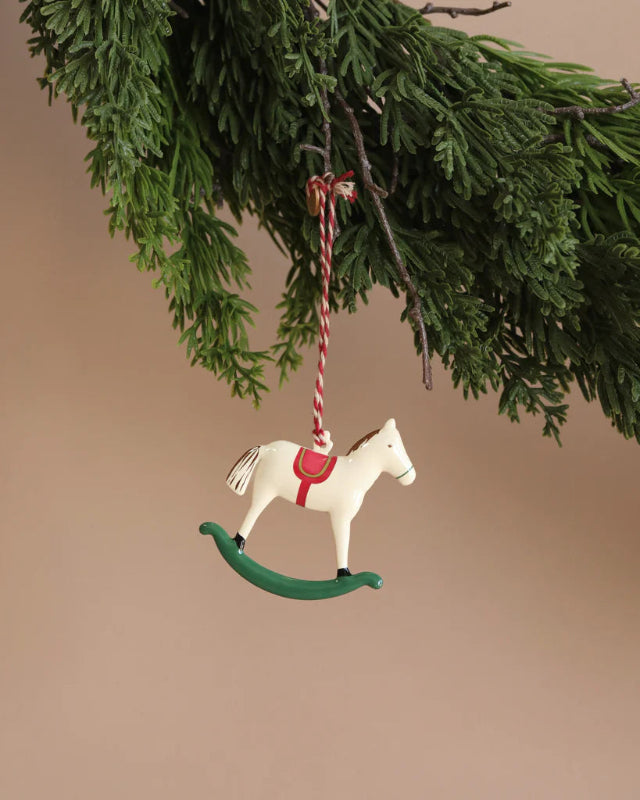 Add a touch of magic to your festive celebrations with this beautifully crafted rocking horse metal ornament in gorgeous cream, red, and green.
