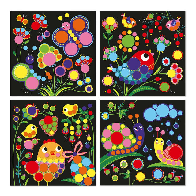 This clever box invites your little ones to decorate 4 paintings featuring funny animals on black backgrounds using beautiful round stickers in different sizes and colours. The contrast against the black makes the colours pop brilliantly! The stickers are perfectly sized for little hands – easy to peel off and stick down, making them ideal for developing fine motor skills and precision.🔴🔵🟣🟡
